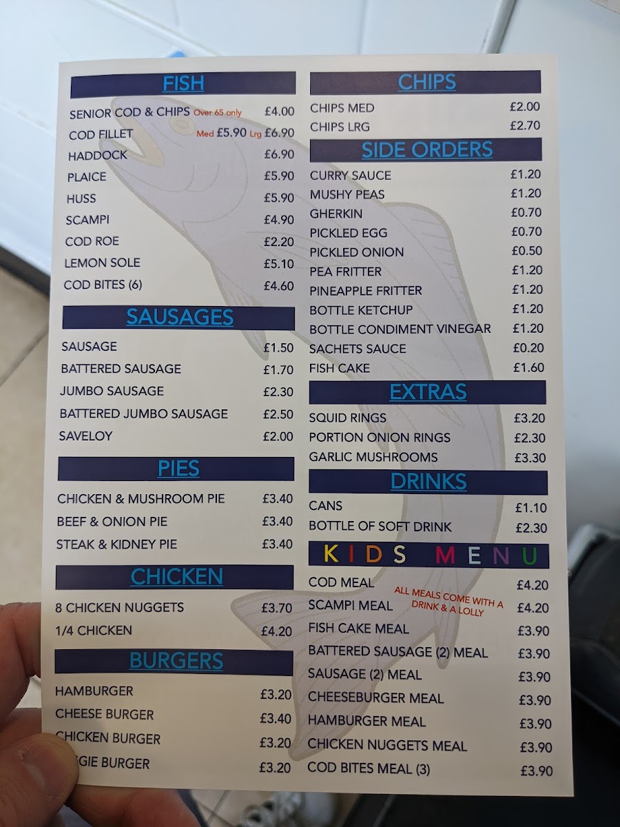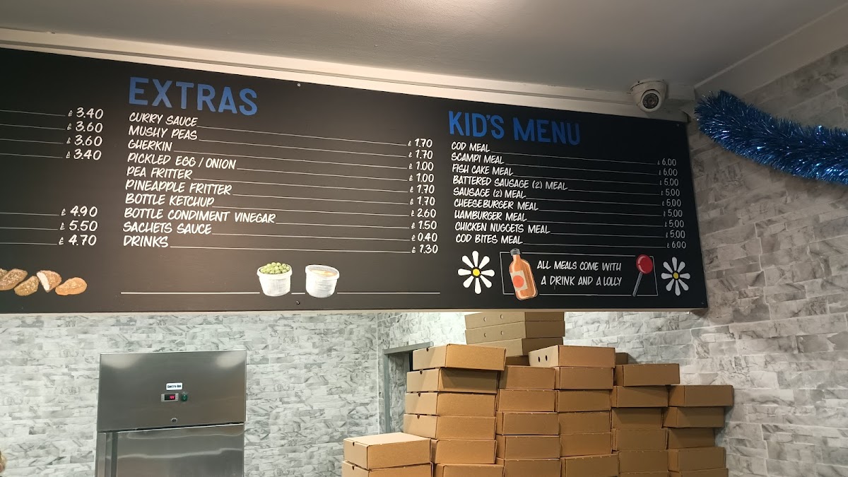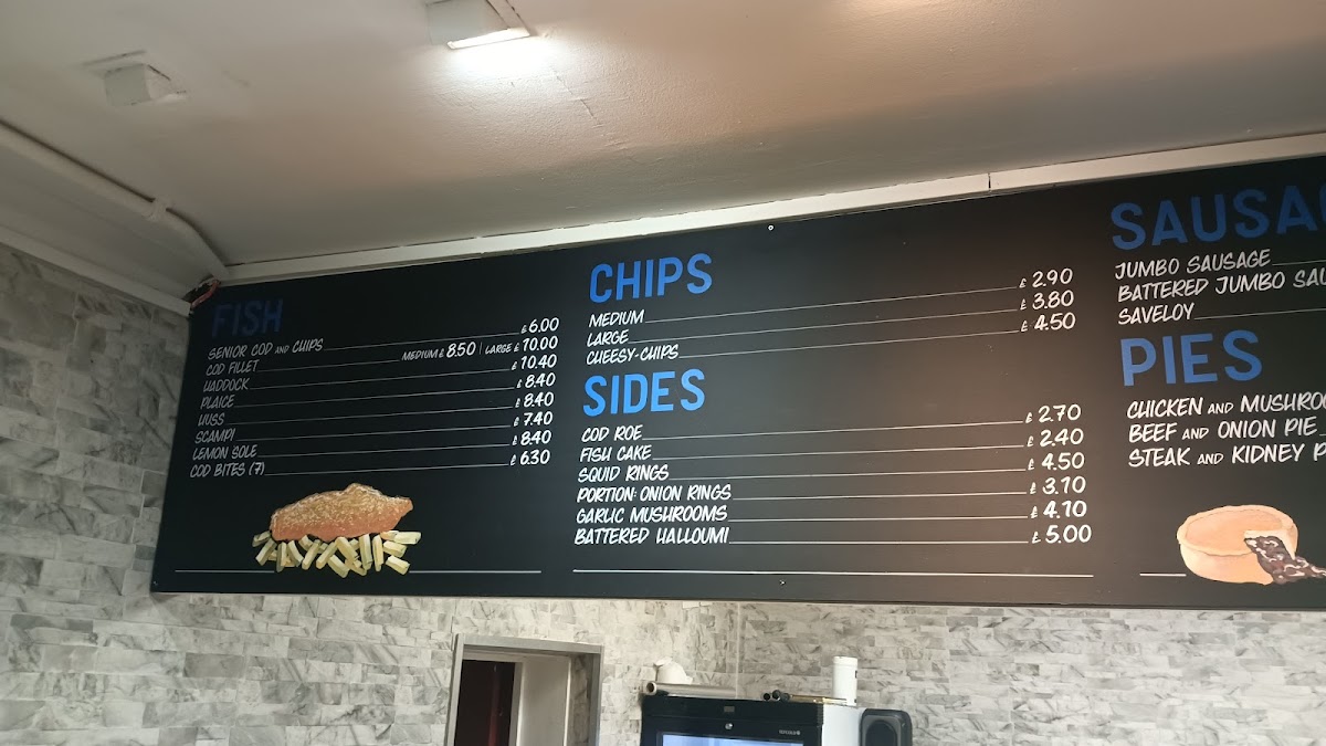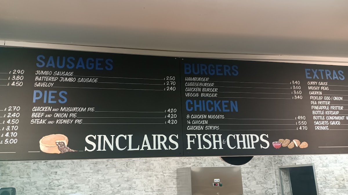 The menu at Sinclair's Fish And Chips offers a wide variety of comforting options, from classic fish and chips to burgers, pies, and more. For burger lovers, there's the Hamburger, Cheese Burger, Chicken Burger, and a Veggie Burger to choose from. The fish selection includes favorites like Scampi, 7pcs Cod Bites, Lemon Sole, and Huss, with options for COD ROE and Cod as well. If you're in the mood for something different, you can try their Saveloy, Battered Jumbo Sausage, or the traditional Jumbo Sausage. The pie offerings include hearty choices such as Chicken Mushroom Pie, Beef Onion Pie, and the classic Steak & Kidney Pie. Chicken lovers can opt for the Chicken Goujon (6pcs), 1/4 Chicken, or 8pcs Chicken Nuggets. For a side, there's everything from Medium Chips and Large Chips to indulgent Cheesy Chips. They also offer tasty side orders like Curry Sauce, Mushy Peas, Gherkin, and Pickled Egg. If you're looking for extras, you can enjoy a Portion of Onion Rings, Squid Rings, or Battered Haloumi (5pcs). Kids have a great selection too, with meals like the Kids 3pcs Cod Bites Meal, Kids Chicken Nuggets Meal, and Kids Scampi Meal. For drinks, there's a range of cans including Coke, Coke Zero, and 7up Can. Don't forget to finish off with a dessert, choosing from flavors like Cookie Dough 450ml, Chocolate Fudge Brownie 450ml, or Caramel Chew Chew 450ml. Plus, for those with dietary restrictions, Sinclair’s also offers Gluten Free options such as Medium Cod and Large Chips.